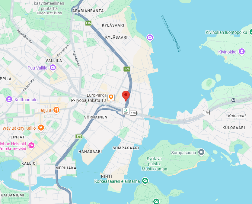 Toimipiste on helposti saavutettavissa kaikilla kulkuvälineillä – Kalasataman metro, raitiovaunu ja bussipysäkit sijaitsee vain muutaman minuutin kävelymatkan päässä.